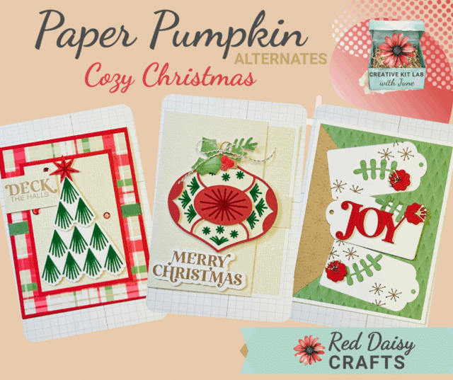Every Sunday, I go live for my Creative Kit Lab, each month starts with an unboxing, which I shared the unboxing of the Cozy Christmas kit and then got to work creating a few alternate project ideas. Today I shared three alternates. It brings me so much joy to sit down, open the box, and see what other directions I can take the supplies — sometimes using just the kit, and sometimes adding in a few coordinating goodies from my craft stash.