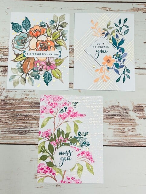 A set of three assorted cards, includes envelopes. These were designed using the Full of Charm Paper Pumpkin kit.